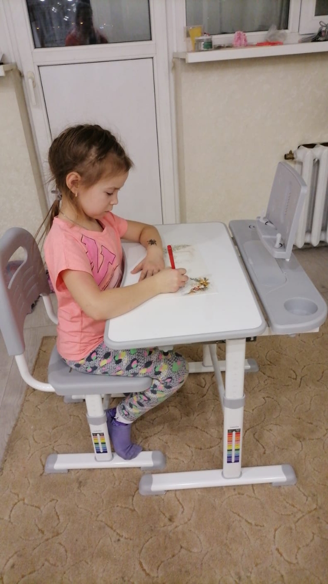 Регулировка высоты стола осуществляется вручную и надежно фиксируется ступенчатым механизмом в необходимом положении. Таким образом, комплект может "расти" вместе с ребенком.